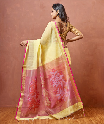 Presenting Slice of Bengal Silk and Cotton Saree with golden Border. Beautiful flower motiff Jamdani on the transparent pallu (Aanchal).Comes with blouse piece.